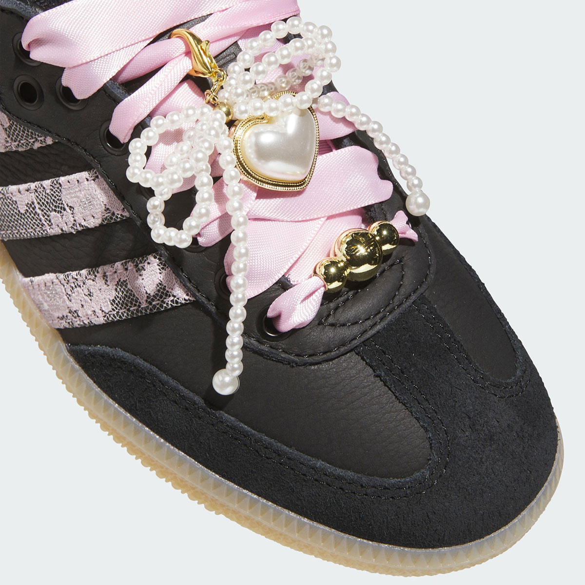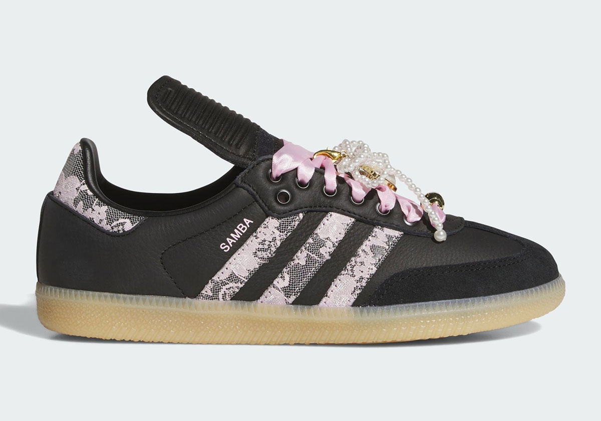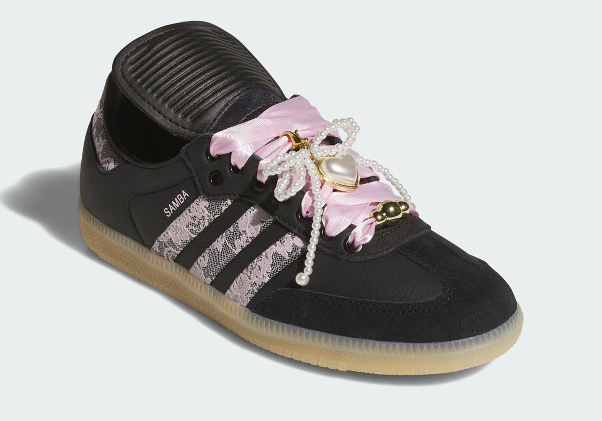 Аксесуари відіграють ключову роль у цьому релізі: перлинний кулон у формі серця, маленька підвіска з пучком перлів і золотистий елемент-дубре з логотипом Trefoil на шнурівках підкреслюють преміальність дизайну. В основі моделі — чорна фактурна шкіра, що надає взуттю контрасту, а світло-коричнева гумова підошва залишається відсиланням до футбольної спадщини Samba. Подовжений язичок додає спортивного шарму, зберігаючи оригінальний дух силуету.